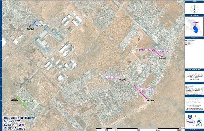 Con esta instalación se llega a un avance de introducción de tubería de 15.58% en el Distrito 4. Estas líneas permitirán conectar los pozos 236, 237, 239 y 240 a los tanques superficiales Real del Desierto I y II; los pozos 246 y 258 al tanque Sierra Vista; y el pozo 232 al tanque Las Haciendas.