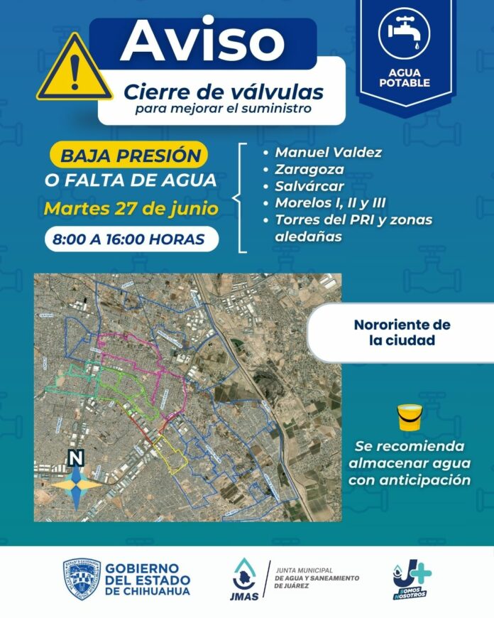 Ciudad Juárez, Chih .- Dicha actividad consiste en cerrar las válvulas de compuerta que se instalaron en meses pasados para aislar dichos sectores, con la intención de asegurar el suministro en gasto y presión equitativos cubriendo la demanda. Los trabajos se realizarán mañana, en un horario de 8:00 a 16:00 horas.