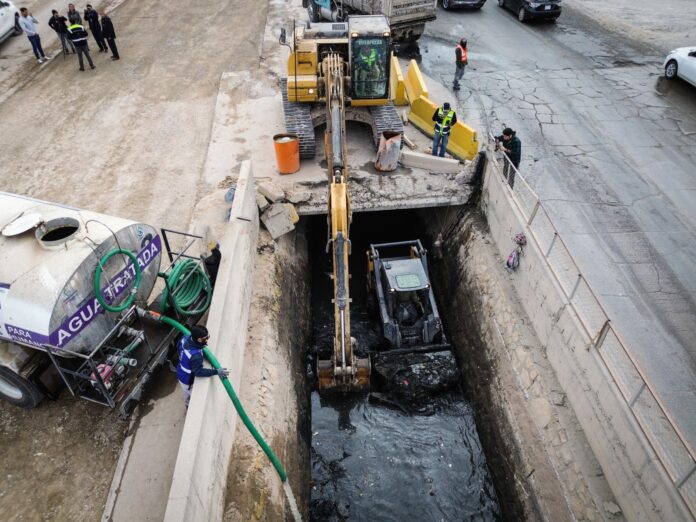 “Estamos descargando agua tratada en la Acequia para generar mayor volumen y mejor arrastre de desechos. Se están utilizando 12 pipas de 10 metros cúbicos cada una. De ayer a hoy, ya llevamos 24 pipas. Al momento de generar ese flujo, llegamos a los denominados sifones, donde se reduce el canal y se acumula todo tipo de basura, como es el caso en embovedado del Viaducto, el de Plaza Juárez Mall y el que está a un costado del Gimnasio Josué Neri Santos, en el Centro”, detalló el ingeniero Rodríguez.