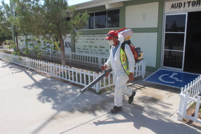Por tal motivo, este día las actividades se desarrollaron en la Guarnición Militar y Noveno Regimiento de Caballería Motorizada; el Mercado Juárez; además se sanitizaron las centrales de abastos, ubicadas en la avenida Aeronáutica y eje vial Juan Gabriel.