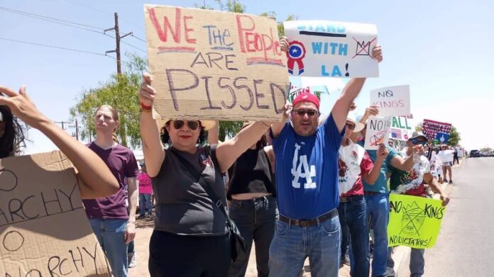 “Hey hey, ho ho, Donald Trump has to go” (Trump debe irse) y “No kings”, fueron las consignas mdurante las casi tres horas que duró la protesta,ante la vigilancia de algunos de los elementos del Sheriff.