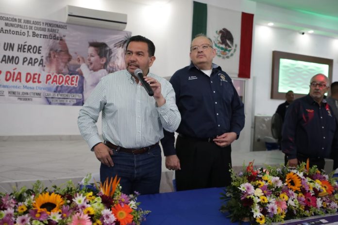 El Presidente Municipal, Cruz Pérez Cuéllar, acudió este sábado al festejo del Día del Padre que organizó la Asociación de Jubilados y Pensionados Municipales de Ciudad Juárez, donde les reconoció la labor, el esfuerzo y empeño que pusieron en su trabajo para hacer de esta una mejor frontera.