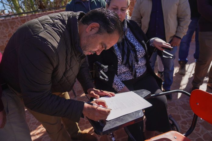 Juárez, Chih (ADN/Adriana Saucedo) En el marco del 13 aniversario luctuoso de Villas de Sálvarcar, esta mañana, el delegado estatal para los programas del desarrollo para el Bienestar, Juan Carlos Loera, encabezó la firma de convenio realizada entre el CBTIS 128 y el equipo deportivo de fútbol americano Jaguares, sobre el uso del campo deportivo.