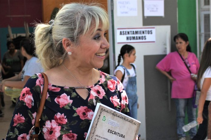 Hace veinte años que la Sra. Montoya concluyó el pago de su vivienda en el fraccionamiento Horizontes, y desde entonces no había podido escriturar por falta de dinero y oportunidades, pero hoy por fin recibió el título de su propiedad el cual le da certeza y seguridad jurídica a ella, y a sus hijos.