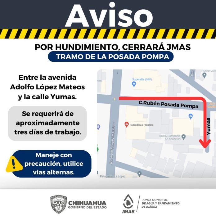 Debido a que se presenta un hundimiento expuesto en la calle Rubén Posada Pompa, la J+ procederá al cierre de dicha vialidad, en el tramo comprendido entre la avenida Adolfo López Mateos y la calle Yumas.