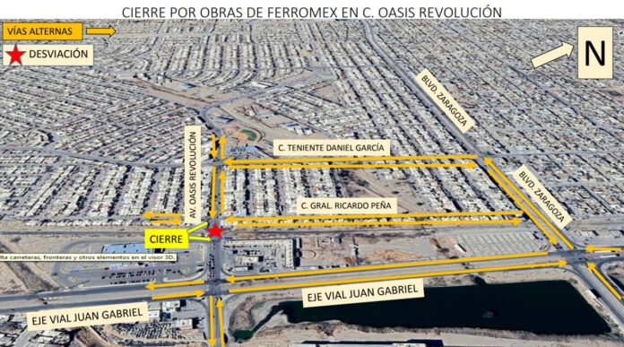 La Coordinación General de Seguridad Vial da a conocer a la ciudadanía que a partir del sábado 13 de septiembre se realizará un cierre parcial sobre la calle Oasis Revolución, en el tramo comprendido que va del Eje Vial Juan Gabriel a la calle General Ricardo Peña, debido a trabajos de mantenimiento en las vías del tren que estará realizando la empresa Ferrocarriles de México (Ferromex).