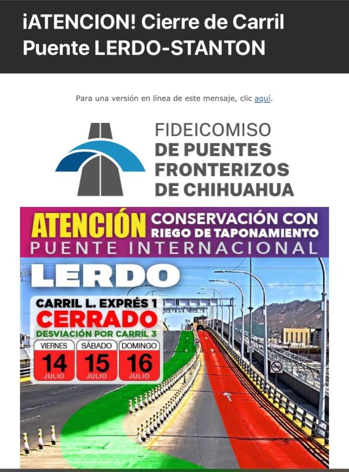 Ciudad Juárez, Chih .- Dentro de los trabajos de mantenimiento de puentes internacionales, el Fideicomiso de Puentes Fronterizos de Chihuahua (FPFCH), a través del Área de Proyectos, informó que los días 14, 15 y 16 de julio estará cerrado el carril 1 de la Línea Exprés del Puedo Lerdo-Stanton, para reabrirse a la circulación el próximo lunes 17 de julio.