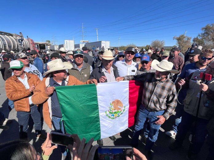 Ciudad Juárez, Chih. (ADN/Arturo Hernández) – Un contingente de aproximadamente 500 productores agrícolas bloqueó este mediodía el carril comercial del Puente Internacional Zaragoza, como parte de una protesta nacional contra las políticas del Gobierno Federal, particularmente en lo relacionado con los precios de garantía del maíz, la inclusión de granos en el Tratado entre México, Estados Unidos y Canadá (T-MEC), y la reforma a la Ley Nacional de Aguas.