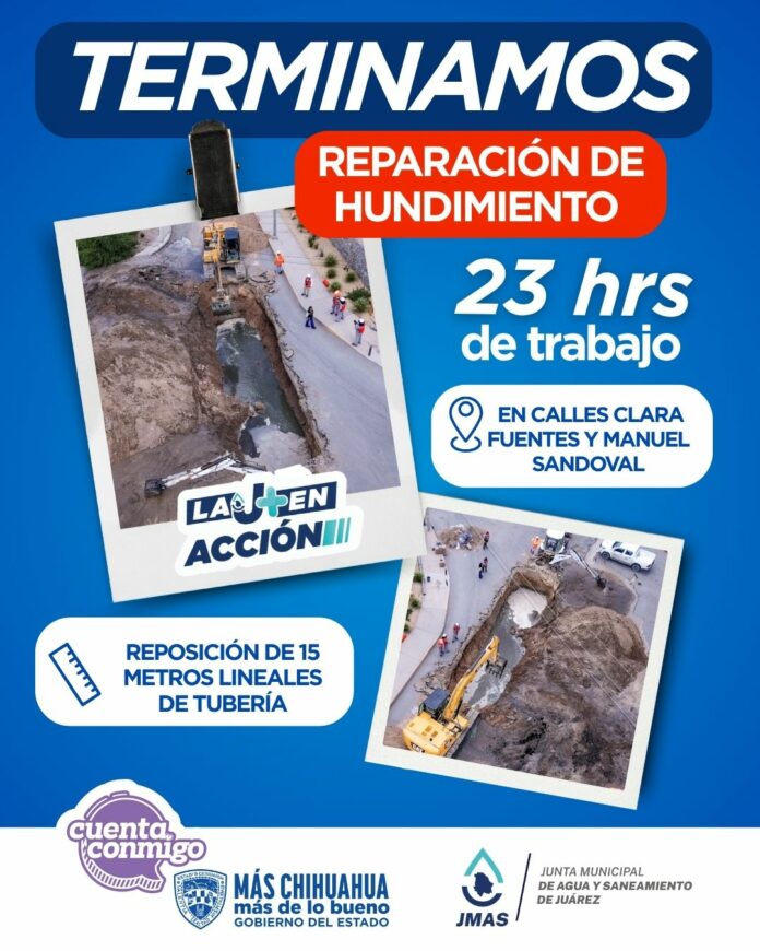 Ciudad Juárez, Chih .- Los trabajos consistieron en la reposición de aproximadamente 15 metros de tubería de la red de alcantarillado, misma que había llegado al término de su vida útil. La oportuna intervención permitió restablecer el servicio de drenaje y frenar los brotes de aguas negras que afectaban a colonias y fraccionamientos cercanos.