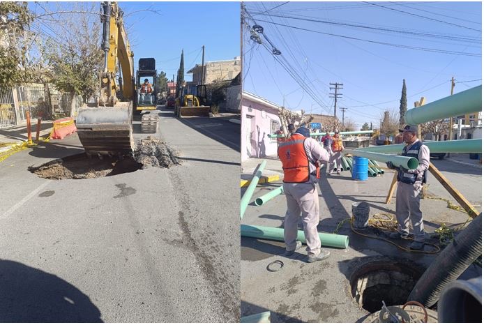 Cuadrillas de la Junta de Agua de Ciudad Juárez, concluyeron la reparación de un hundimiento expuesto en un colector de 48 pulgadas de longitud, en el cruce de las calles Coyoacán y Belice, en la colonia Margaritas.