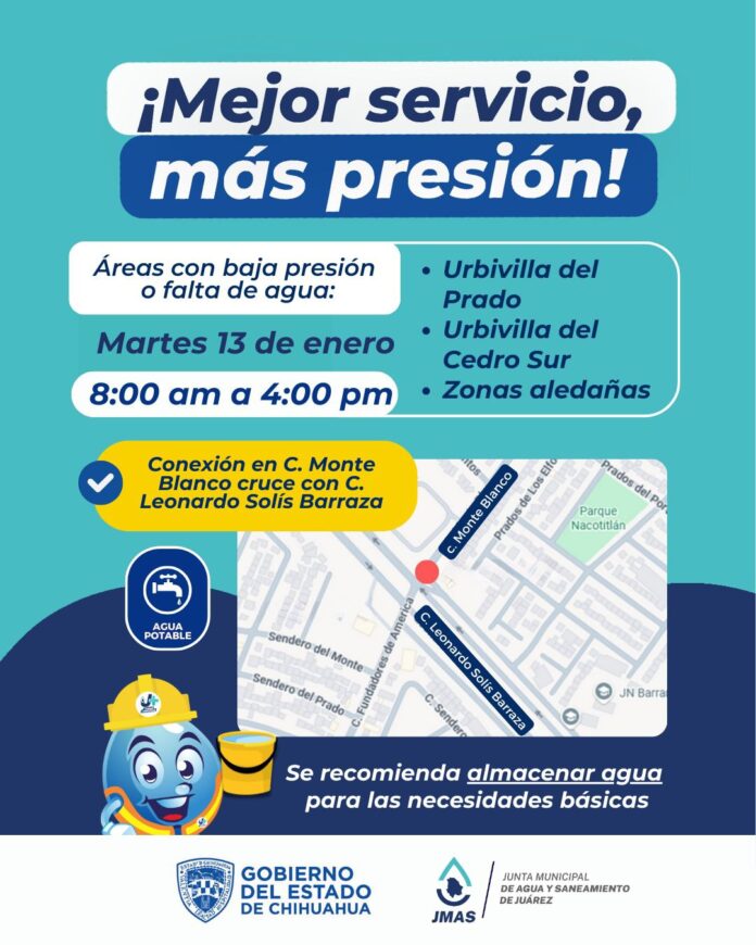 Ciudad Juárez, Chih. (ADN/Staff) – La Junta Municipal de Agua y Saneamiento de Juárez (JMAS) concluyó los trabajos de instalación de una nueva línea de agua potable en las calles Monte Blanco y Leonardo Solís Barraza, con el objetivo de mejorar la presión del servicio y atender reportes recurrentes de baja distribución en el suroriente de la ciudad.