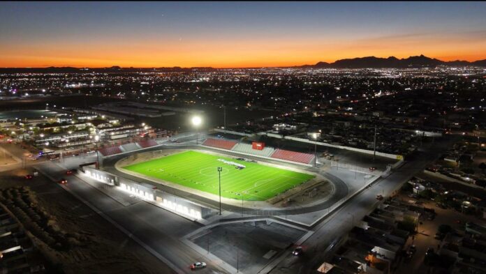 Ciudad Juárez, Chih .- Daniel González García, director general de la dependencia, detalló que ya fueron concluidos los trabajos de instalación de alumbrado público en el lugar, colocando cuatro postes de 20 metros de altura con cinco lámparas de mil watts que iluminan de manera directa la cancha de pasto sintético, la pista de tartán y gradas, además de 30 arbotantes dobles para estacionamiento y exterior del inmueble.