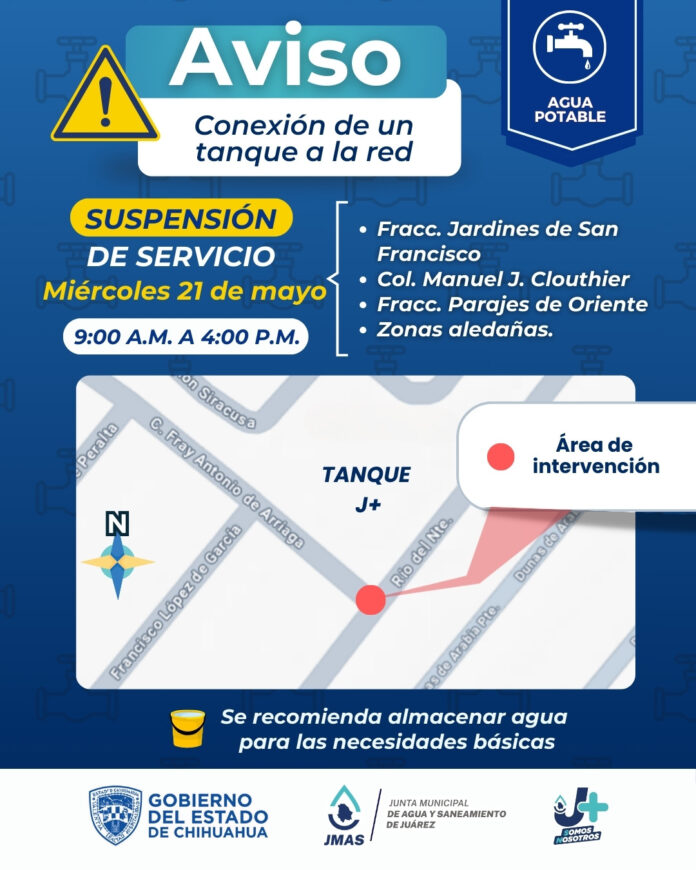 Durante este horario, se presentará falta de servicio de agua potable en los fraccionamientos Parajes de Oriente y Jardines de San Francisco, así como en la colonia Manuel Jesús Clouthier y zonas aledañas.