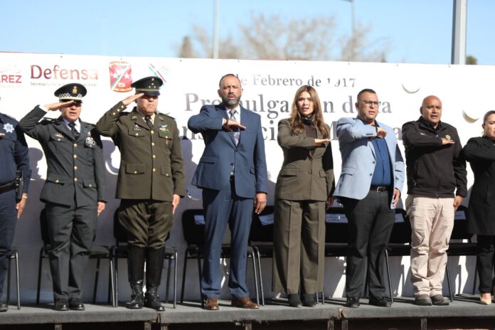 Ciudad Juárez, Chih. (ADN/Staff) – En el marco del 109 Aniversario de la promulgación de la Constitución Política de los Estados Unidos Mexicanos y del inicio de la campaña Febrero, Mes del Ejército y Fuerza Aérea Mexicanos, el Gobierno Municipal llevó a cabo la Ceremonia de Izamiento de Bandera, como un acto cívico orientado a fortalecer los valores de legalidad, identidad nacional y reconocimiento a las instituciones armadas.