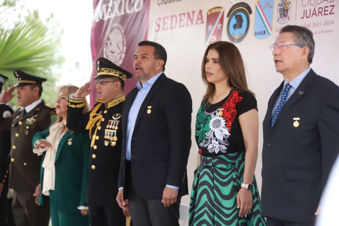 Ciudad Juárez, Chih .- El Presidente Municipal, Cruz Pérez Cuéllar y el General Brigadier Diplomado del Estado Mayor, Jorge Alberto Buchan Martínez, comandante de la Guarnición Militar de la Plaza, encabezaron la ceremonia que se llevó a cabo en el monumento a los Niños Héroes en la avenida Del Charro, acompañados de elementos militares, funcionarios municipales y estudiantes de la Escuela Secundaria Técnica número 15.
