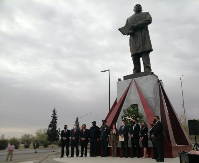 Ciudad Juárez, Chih. – El Gobierno Municipal a través de la Dirección de Educación realizó esta mañana la ceremonia protocolaria para conmemorar el 215 Natalicio del Lic. Benito Pablo Juárez García, evento que se desarrolló en las inmediaciones del monumento ubicado en avenida De Las Américas, en donde fue colocada una ofrenda floral y se realizó una guardia de honor.