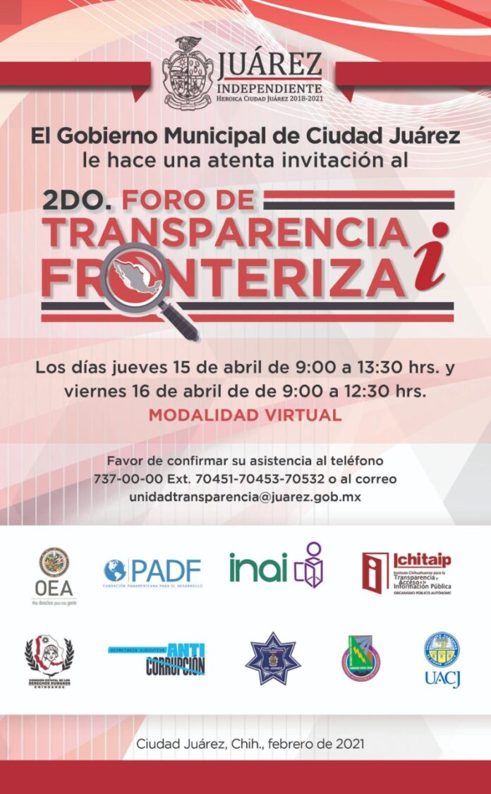 Ciudad Juárez, Chih.- Se informó que las charlas se realizarán de manera virtual a partir del 15 de abril en un horario de 9:00 a 13:00 horas, comenzando con la conferencia magistral “La lucha contra la corrupción” de Juan Pablo Pozo Bahamonde, de la Organización de los Estados Americanos; seguida por “La puerta hacia mejores mecanismos de Transparencia Proactiva”, de Blanca Lilia Ibarra Cadena, Comisionada Presidenta del INAI.