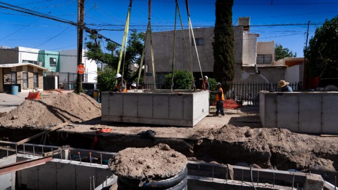 Ciudad Juárez, Chih. (ADN/Staff) – La Junta Municipal de Agua y Saneamiento (JMAS) de Juárez avanza en la construcción de infraestructura pluvial en el cruce de las calles Apolo y Atlante, con el objetivo de mitigar inundaciones que han afectado a la zona durante más de medio siglo.