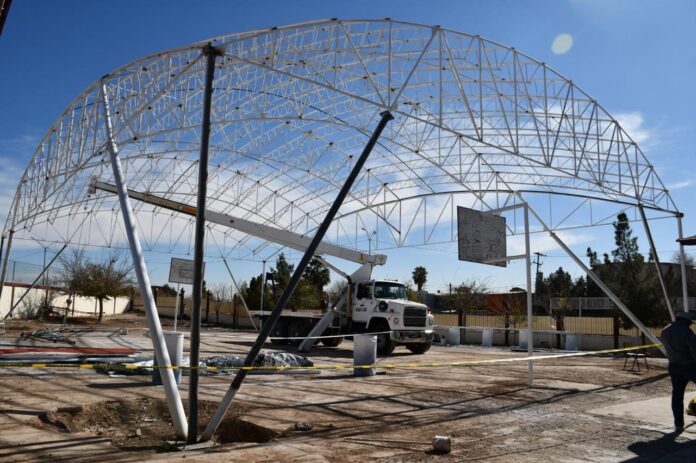 Ciudad Juárez, Chih. (ADN/Staff) – La Dirección General de Obras Públicas avanza en la construcción de un domo en la Escuela Primaria Ramona Soto de González, ubicada sobre la calle Benemérito de las Américas, en la colonia Infonavit Casas Grandes, con el objetivo de mejorar las condiciones para el desarrollo de actividades escolares al aire libre.