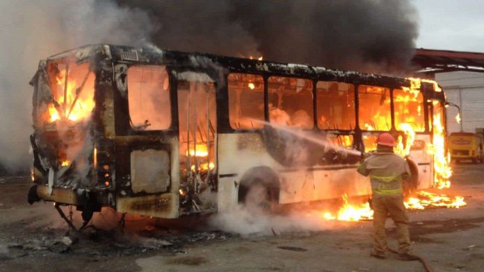 Ciudad Juárez, Chih. (ADN / Arturo Hernández) – La noche de este sábado al menos seis camiones de una línea de transporte de personal que presta su servicios en el sector maquilador, fueron consumidos por las llamas, y de acuerdo a datos preliminares, el fuego fue provocado por un sujeto que fue detenido por algunos testigos.