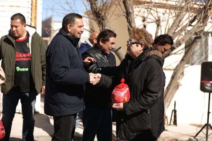 Ciudad Juárez, Chih. (ADN/Staff) – El presidente municipal Cruz Pérez Cuéllar continuó este sábado con la entrega de apoyos alimentarios en distintas colonias de la ciudad, al acudir por la tarde a la colonia Torres del PRI, donde convivió con vecinos y entregó piernas de cerdo como parte de las acciones por la cuesta de enero.