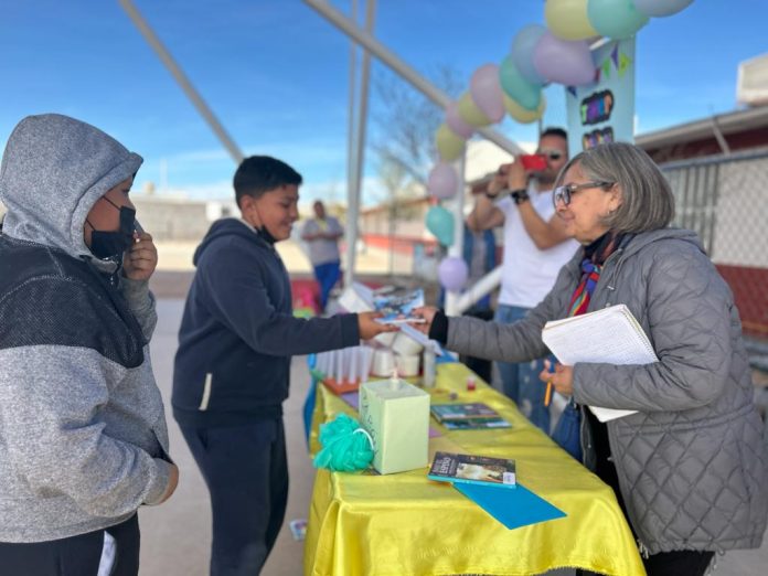 Ciudad Juárez, Chih .- Gilberto Gutiérrez, subdirector de DIF y Perla Márquez, coordinadora de Comunicación Social llevaron a cabo la entrega simbólica a dos alumnos de cada grado escolar, en medio de un ambiente de alegría en la plazoleta del plantel. Invitaron a la comunidad escolar a practicar la lectura como medio inmediato de conocer otros mundos y llevaron un mensaje de la presidenta del DIF Rubí Enríquez.