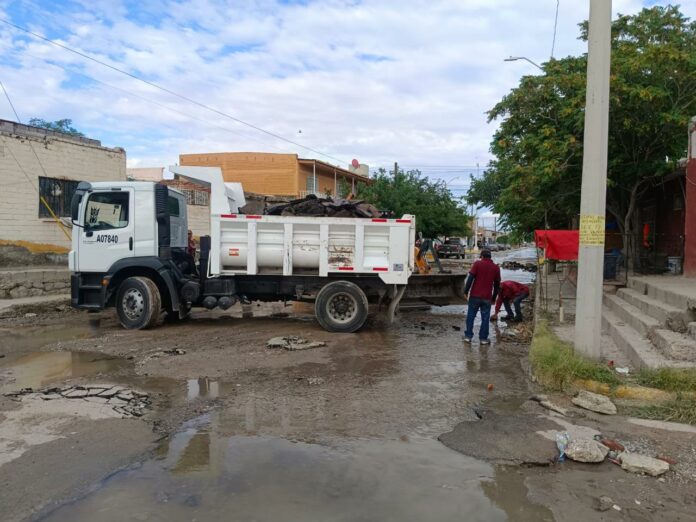 Dando continuidad a las labores de apoyo para las familias que se vieron afectadas por las lluvias de ayer, la Dirección General de Obras Públicas trabaja en la colonia Fronteriza en la limpieza y rastreo de calles dañadas por la fuerte corriente de agua.
