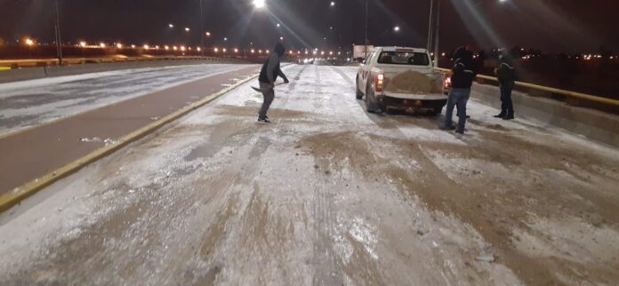 Detalló que en el operativo participan 30 unidades municipales, quienes con palas esparcen la mezcla que facilita el deshielo y busca prevenir accidentes ante la cristalización del pavimento.