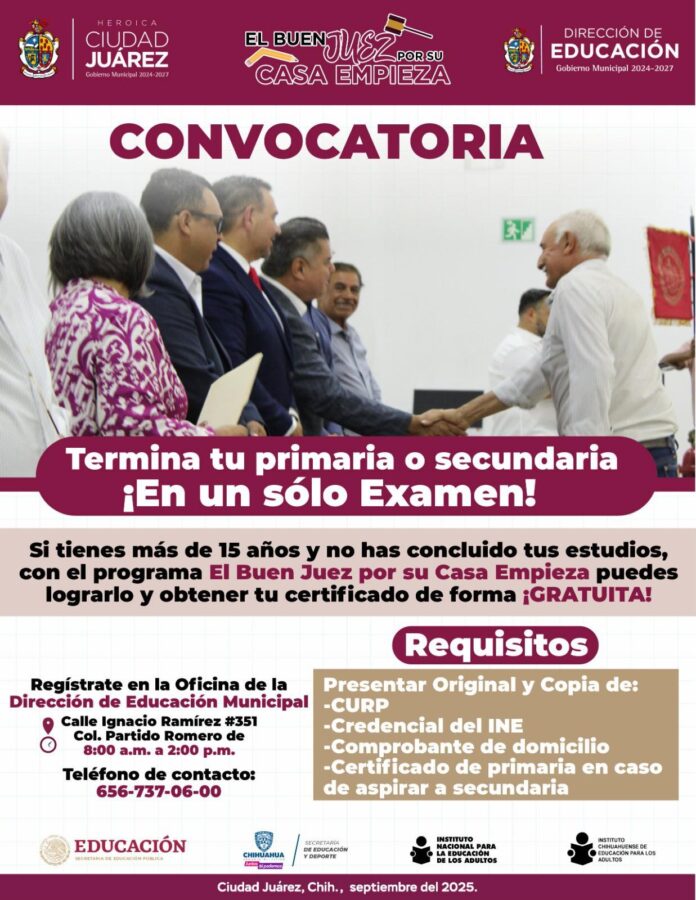 La Dirección de Educación Municipal, en coordinación con el Instituto Chihuahuense de Educación para los Adultos (ICHEA), invita a la ciudadanía a participar en el programa “El buen juez por su casa empieza”, mediante el cual es posible obtener el certificado de primaria o secundaria con un solo examen.