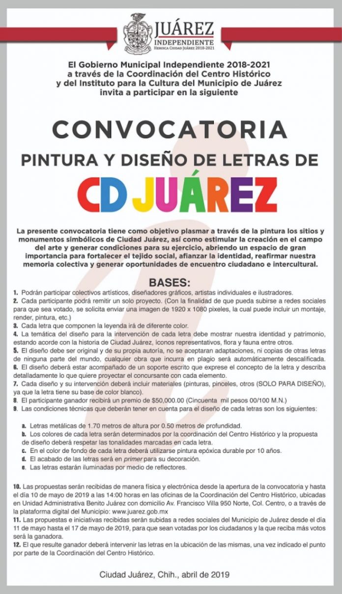 Las bases de esta convocatoria estarán disponibles para su consulta a partir del miércoles 24 de abril en la página www.juarez.gob.mx y en los principales medios de comunicación de la ciudad.