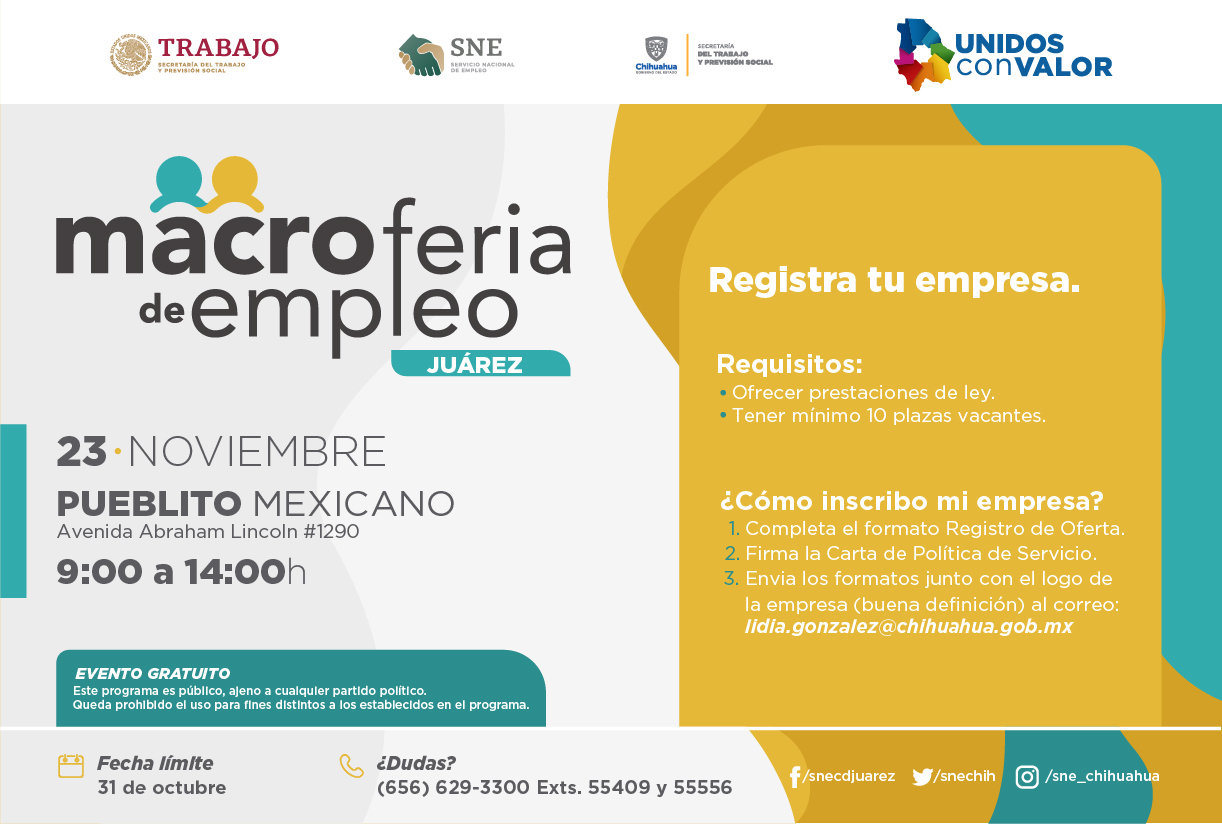 Ciudad Juárez, Chih. – El Gobierno del Estado de Chihuahua, a través de la Secretaría del Trabajo y Previsión Social (STPS) Chihuahua y el Servicio Nacional de Empleo (SNE) Unidad Regional Juárez, convoca a las empresas que busquen cubrir sus vacantes a registrarse en la Macro Feria de Empleo 2019.