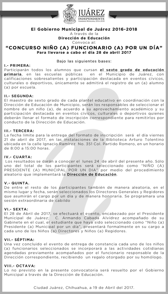 Ciudad Juárez, Chih. – El Gobierno Municipal a través de la Dirección de Educación convoca a las niñas y niños que cursan el sexto año de primaria a participar en el evento “Niño funcionario por un día”, a celebrarse el próximo viernes 28 de abril.