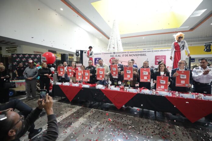 Ciudad Juárez, Chih. (ADN/Staff) – El Presidente Municipal Cruz Pérez Cuéllar dio este jueves el banderazo oficial al Buen Fin 2025 desde el centro comercial Plaza Juárez Mall, acompañado por representantes de los tres niveles de gobierno, empresarios locales y organismos de seguridad. En su mensaje, el edil destacó que esta campaña comercial, hoy consolidada a nivel nacional, tuvo su origen en esta ciudad hace 17 años bajo el lema “Si en Juárez compramos, todos ganamos”.