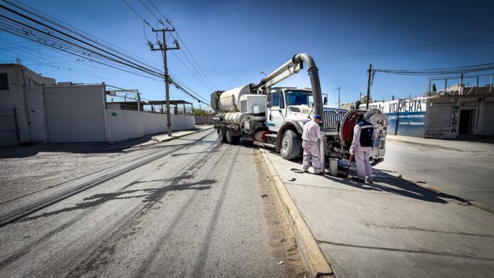 Labores de mantenimiento para retirar toda la suciedad acumulada en la red de drenaje de la colonia Gómez Morín, realiza este miércoles la J+ con la utilización de tres equipos vactor y una cuadrilla de plomeros.