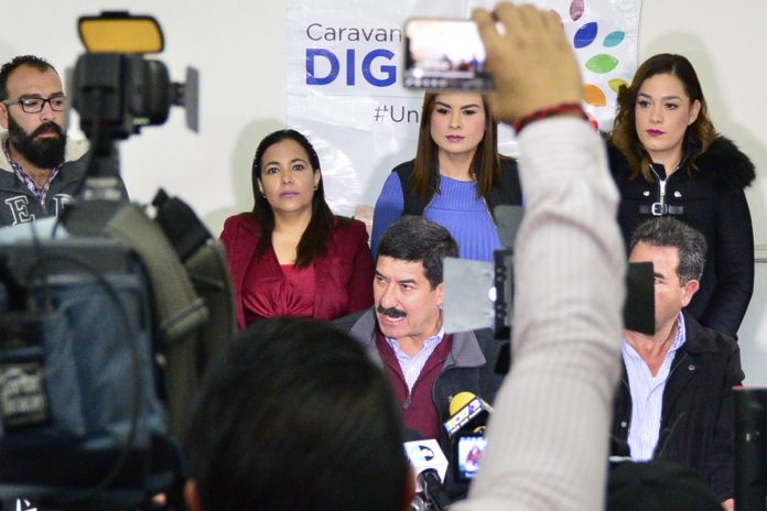 El encuentro con medios de comunicación tuvo lugar en el Hotel Avenida, tras el arribo de la Caravana por la Dignidad Unidos con Valor a esta ciudad.
