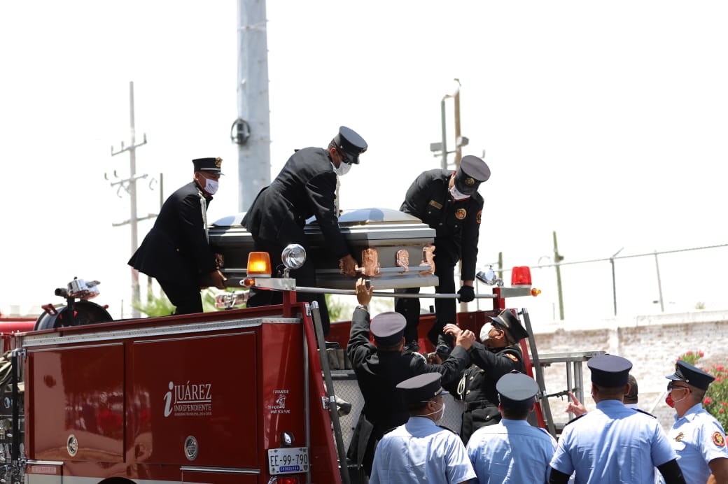 Ciudad Juárez, Chih. – Las honras fúnebres se llevaron a cabo en el cuarto de máquinas de la Estación Central, donde sus compañeros hicieron una valla a fin de que el féretro pasara por ahí, el cual llegó en una de las unidades acompañado por sus hermanos bomberos.