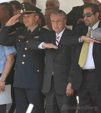 En el templete colocado a un costado de la casa de Juan Gabriel, justo en la esquina de 16 de septiembre y Perú, el presidium encabezado por el Presidente Municipal, Enrique Serrano Escobar, cobijado por la totalidad de funcionarios de primer nivel de su administración, prestos se dispusieron a disfrutar de los contingentes.