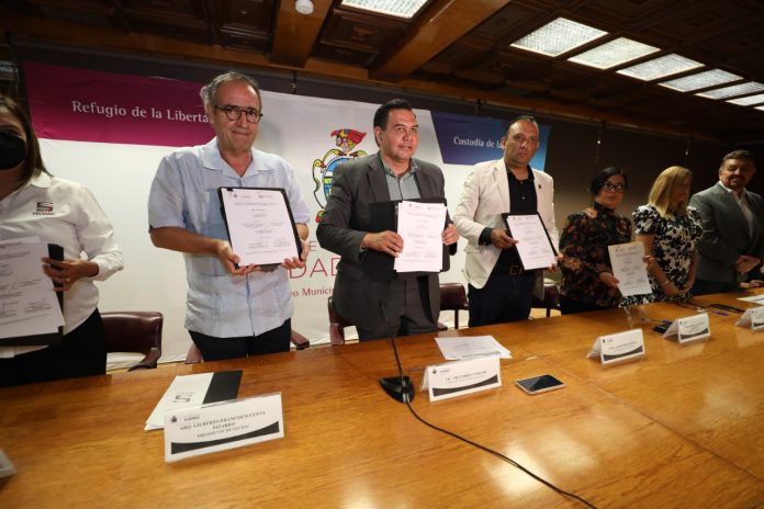 La firma de convenio estuvo encabezada por el alcalde y el presidente del Consejo Local Juárez de la Fechac, Gilberto Cueva Pizarro.