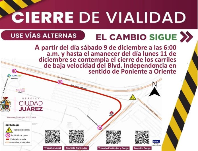 Ciudad Juárez, Chih .- Desde las 6:00 de la mañana del sábado 9 de diciembre y hasta el amanecer del 11 de diciembre, la circulación de los carriles de baja velocidad del bulevar Independencia, en el tramo que va desde la calle Efraín González Luna hasta la calle Manuel Herrera Lazo, se verán interrumpidos al tráfico habitual, por lo que se recomienda tomar vías alternas para evitar congestionamientos viales.