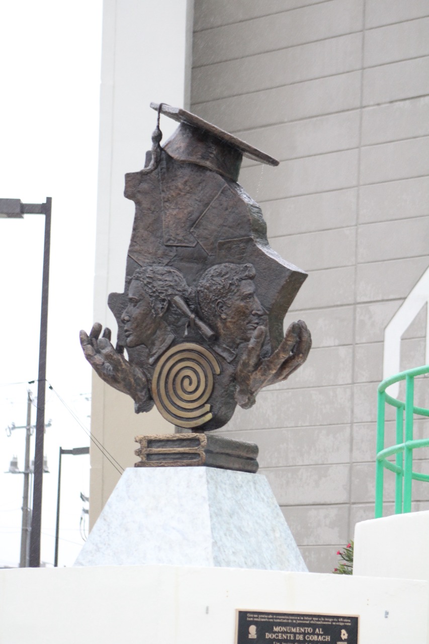 Ciudad Juárez, Chih. – Reconoce Colegio de Bachilleres del Estado de Chihuahua, labor de docentes de este sub sistema de enseñanza, con la develación de un monumento en su honor instalado al exterior del Gimnasio del Cobach, en el Parque Central Poniente.