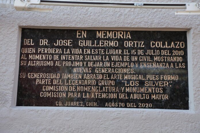 Ciudad Juárez, Chih. – Durante la mañana de este día se develó la placa en memoria del doctor José Guillermo Ortiz Collazo, quien perdió la vida el 15 de julio del 2010, en la explosión de un coche bomba.