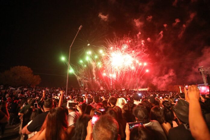 Posterior al Grito de Independencia que encabezó el Presidente Municipal, Cruz Pérez Cuéllar, las miles de familias asistentes disfrutaron de un espectáculo de drones y pirotecnia.
