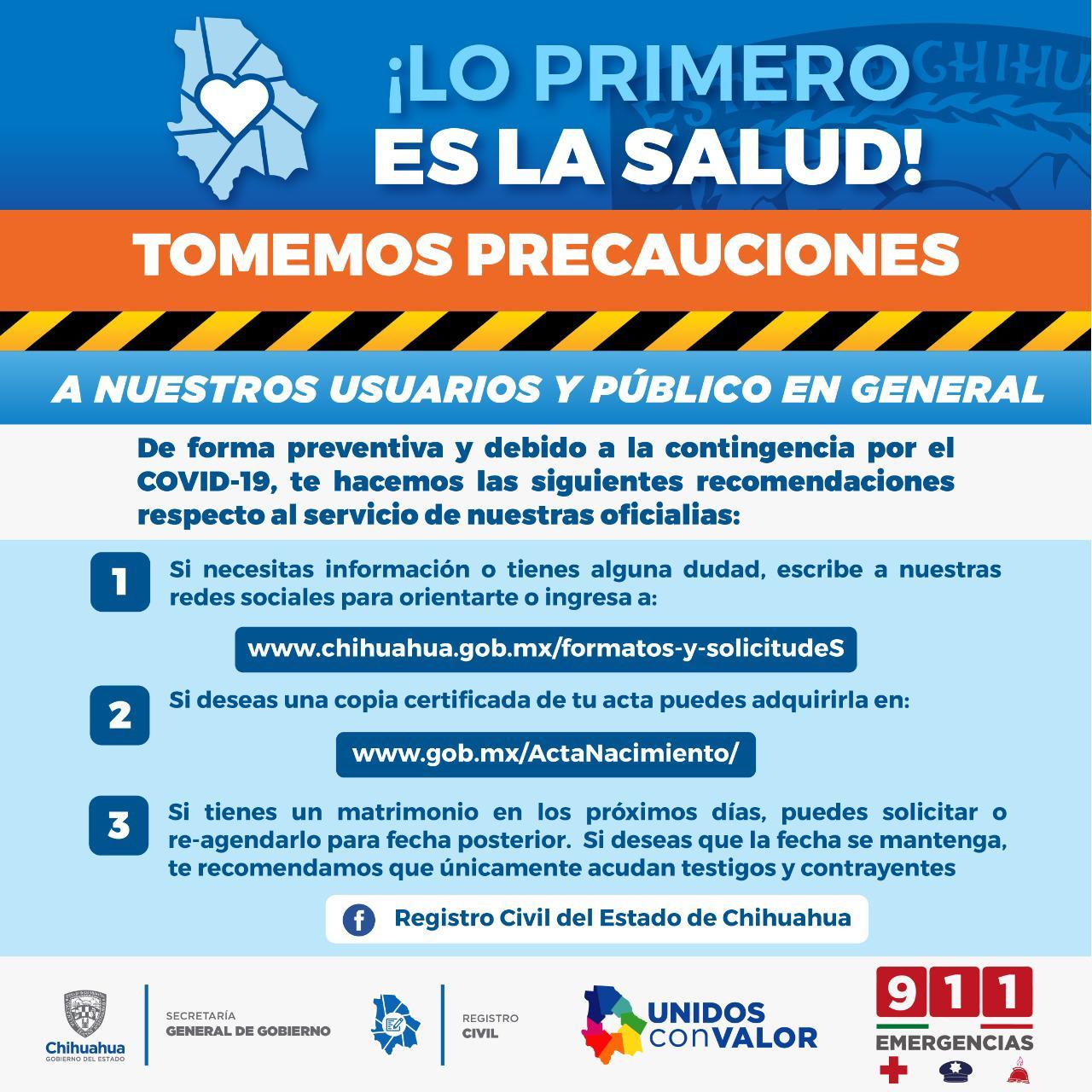 De manera preventiva ante el COVD-19, las oficialías del Registro Civil en Ciudad Juárez, exhorta a la ciudadanía a utiliza las redes sociales de la dependencia para realizar algunos trámites, ya que muchos de ellos estarán suspendidos de manera presencial hasta nuevo aviso.