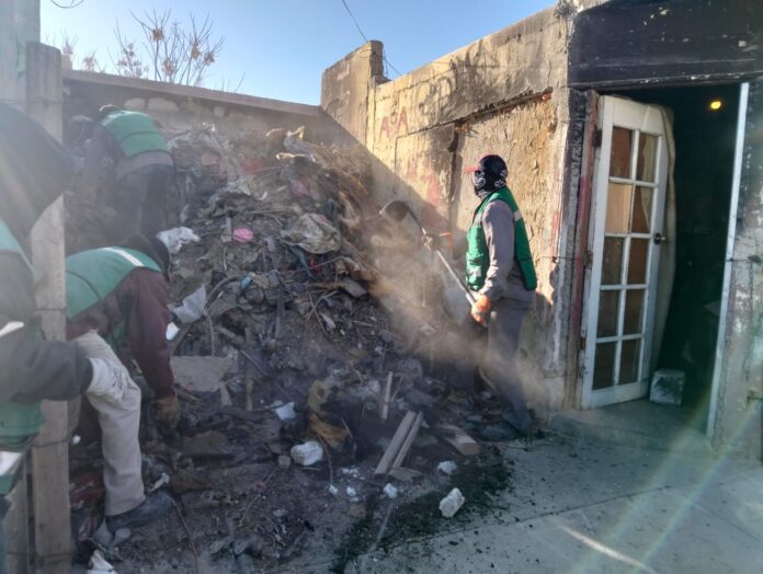 Ciudad Juárez, Chih. (ADN/Staff) – Cuadrillas de la Dirección de Limpia eliminaron un foco de infección en una vivienda abandonada ubicada en la calle Puerto Nápoles, la cual era utilizada como tiradero clandestino y donde se detectó presencia de garrapatas y otras plagas.