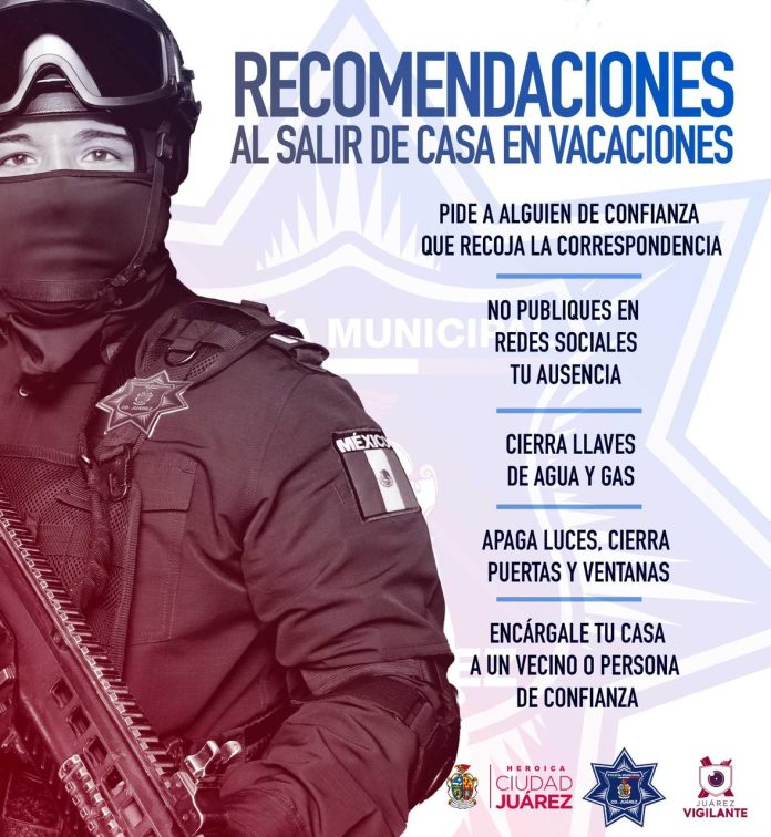 Ciudad Juárez, Chih .- Estas sugerencias se hacen debido a que los delincuentes aprovechan la ocasión en la que varias familias se ausentan de sus domicilios en vacaciones.