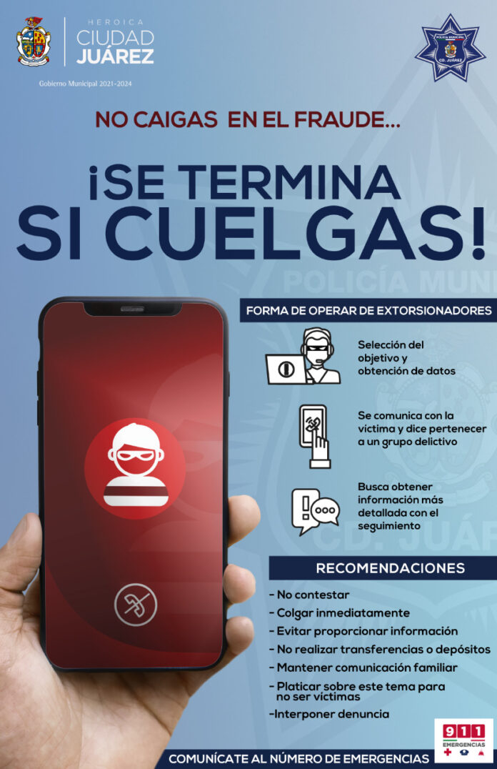 Ciudad Juárez, Chih .- La Secretaría de Seguridad Pública Municipal emite una serie de recomendaciones para evitar que la ciudadanía sea víctima de extorsión y fraude a través de llamadas telefónicas, donde bajo amenazas de muerte, delincuentes exigen el depósito de fuertes cantidades de dinero a cambio de no atentar en contra de amigos y familiares.