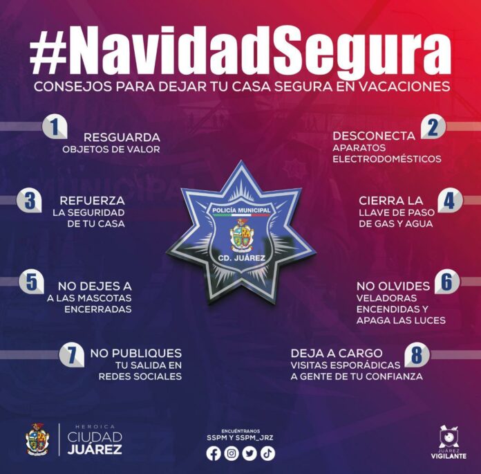 Ciudad Juárez, Chih .- Debido a que varias familias juarenses se ausentan de sus domicilios durante este periodo, la policía municipal pide a la ciudadanía a tomar en cuenta las siguientes recomendaciones a fin de evitar ser víctimas de alguna incidencia delictiva.