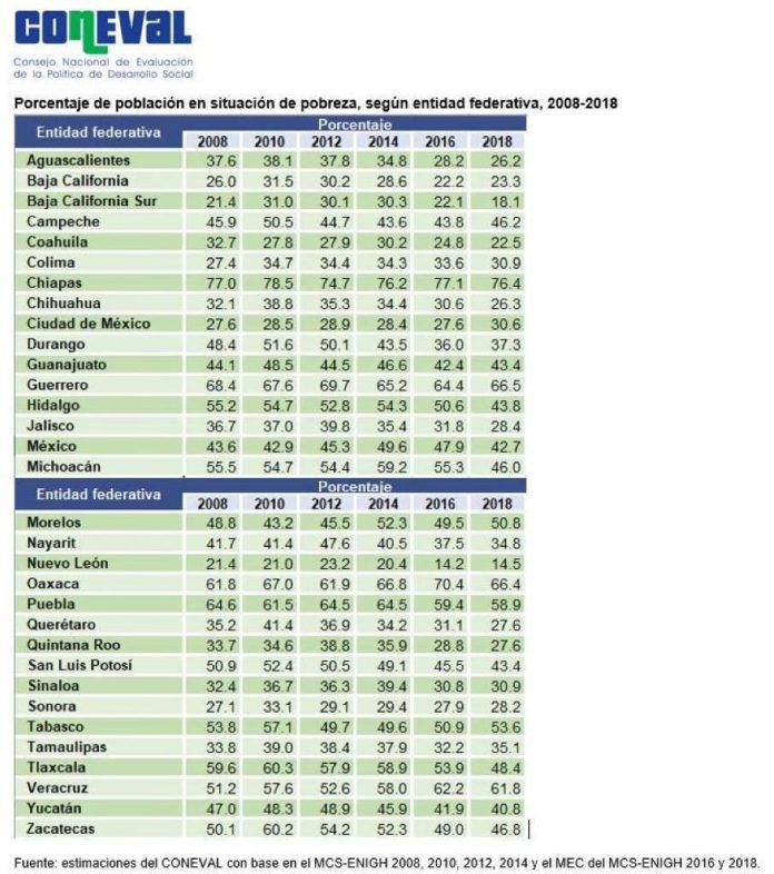 De esta manera, Coneval determinó que en 2018 el estado con menos pobreza es Nuevo León con un porcentaje de 14.5; el segundo es Baja California Sur con 18.1%; Coahuila con 22.5% ocupa la tercera posición; Baja California, la cuarta con 23.3%; Aguascalientes es el quinto con 26.02; y Chihuahua, el sexto con 26.3% (apenas 0.01% después).