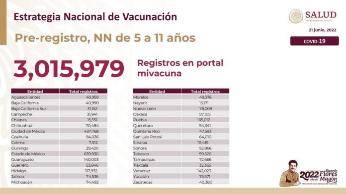 A través de sus redes sociales, dio a conocer que ya son 3 millones 15 mil 979 las niñas y niños que fueron inscritos en el sitio mivacuna.salud.gob.mx por sus madres, padres o tutores para acceder a la vacuna para enfrentar a la pandemia desde el pasado 16 de junio, cuando se abrió el registro.