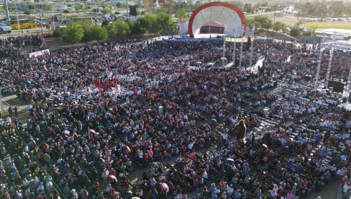 Ciudad Juárez, Chih. (ADN/Staff) – El alcalde de Ciudad Juárez, Cruz Pérez Cuéllar, encabezó un evento masivo en la Plaza de la Mexicanidad, donde más de 50 mil personas se congregaron en una jornada que combinó espectáculo musical y posicionamiento político.